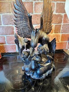 Personal Story: The picture below was an item in an estate we were setting up. This carving was set to be sold at $25.00. It was in a corner of the lanai, behind a chair. It was covered in artificial greenery, and it had a set of the battery operated LED lights around it. You could barely see the carving.
